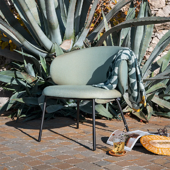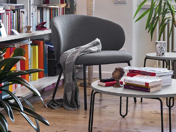 Fotelja TUKA od metalnih cevi. Školjka sa širokim, obuhvatajućim naslonom i zaobljenim sedištem, dostupna u 100% recikliranom polipropilenu ili tapacirana i jastučasta.