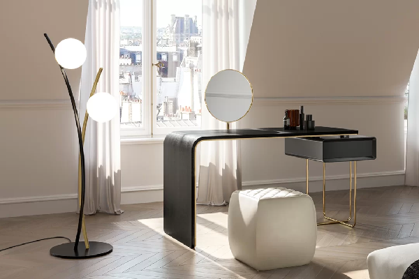 Auri Desk je minimalistički sto sa besprekornim stilom, pogodan čak i za najmanje prostore. Sto sa minimalističkim i osnovnim stilom sa fiokom definisan je snažnim dizajnerskim identitetom koji podseća na retro estetiku. Elegantna obojena metalna osnova nosi fioku na kojoj se nalazi jedna strana police. Gornja ploča i prepoznatljiva zakrivljena noga su napravljene od furniranog drveta, ukrašene prefinjenim donjim profilom u kontrastnom lakiranom drvetu. Ovaj dodatak za nameštaj može se koristiti i kao toaletni sto: nudi prefinjeno i praktično ekstra providno koso ogledalo. Udobna kožna podloga je dostupna na zahtev.