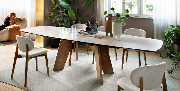 Viktor sto se ističe po svojoj osnovi, sa dva nosača od obojenog jasena, koji stvaraju prepoznatljiv grafički potpis i daju dinamičnost i vizuelni zamah celom dizajnu. Rafinirana i izdržljiva keramička ploča se harmonično integriše sa osnovom, pojačavajući kontrast između materijala. Ravnoteža između čvrstine i lakoće čini ovaj sto upečatljivim komadom, sposobnim da ulepša svaki prostor svojom elegancijom.