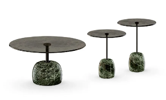 Klub stočić „Sir“ je skulpturalni centralni element koji transformiše svaki životni prostor u galeriju prefinjenog ukusa. Njegova smela silueta kombinuje zaobljenu čvrstu mermernu osnovu sa svetlećim vrhom od spojenog stakla, spojenim elegantnim nosačem od obojenog metala. Ova interakcija tekstura i materijala stvara dinamičan vizuelni iskaz koji obuhvata modernu estetiku. Bilo da je stilizovan solo ili u ugnežđenom aranžmanu, „Sir“ donosi ravnotežu, eleganciju i nepogrešivu klasu svakom savremenom prostoru.