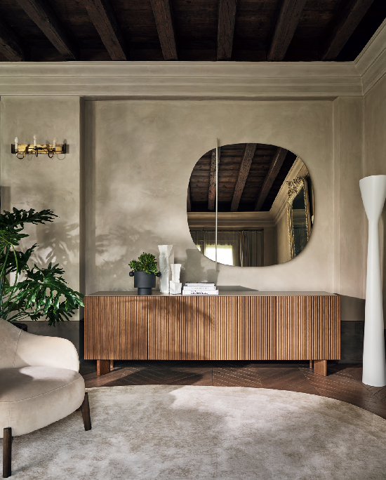Vertikalna vrata imaju motiv kanelova u dve opcije završne obrade. Staklo, tradicionalno i elegantno, oživljava klasični komod sa savremenim preokretom. Drvo, toplo i sofisticirano, poboljšava materijal, donoseći novu taktilnu dimenziju životnom prostoru.