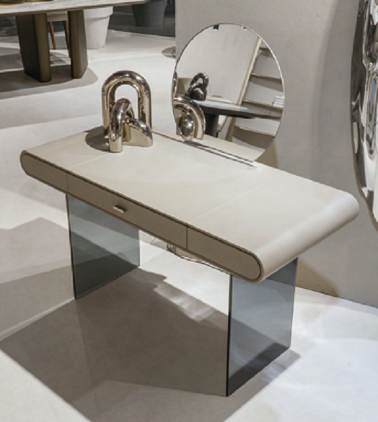 Sto „Bice“ je moderna reinterpretacija klasičnog toaletnog stočića – transformisan u elegantan i funkcionalan pisaći sto sa jedinstvenim dizajnerskim šarmom.Dizajniran od strane Nela Palombe, sto „Bice“ odlikuje se prefinjenim linijama i prepoznatljivom centralnom fiokom koja dodaje i upotrebnu i estetsku vrednost.Njegova oblikovana gornja ploča, u potpunosti presvučena kožom, u kontrastu je sa dve noge od providnog, dimljenog ili bronzanog stakla, što komadu daje vizuelnu lakoću i modernu sofisticiranost.
