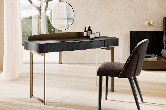 Lyra Vanity je elegantni toaletni stočić sa ogledalom: savršen komad nameštaja za rekreaciju šminkernice tipične za spavaće sobe iz prošlosti, ali sa savremenim stilom. Lyra Vanity, opremljen veoma udobnim stonim ogledalom, napravljen je sa postoljem, okvirom i gornjom površinom obojenim u bronzu, dok je polica u elegantnom crnom jasenu sa lakiranim profilom. Ovaj elegantni toaletni stočić sa ogledalom je idealan za polako doživljavanje trenutaka intimnosti: koristite ga kao hram ženske lepote, ali i kao hram luksuza, gde možete da se prepustite malo više frivolnosti.