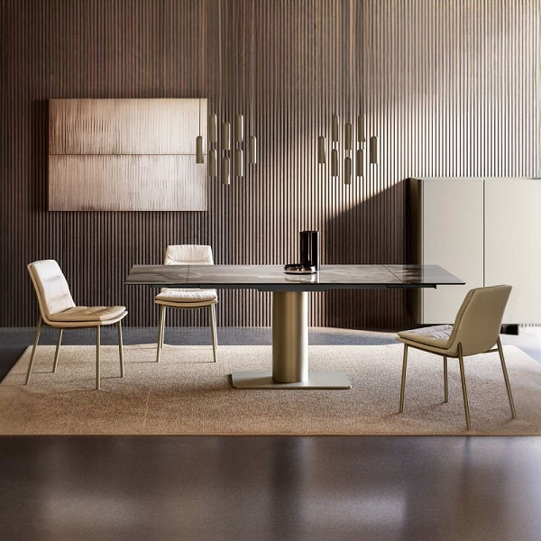 Kolekcija stolova sa čistim i suštinskim dizajnom. Karakterističan element je cilindrična osnova od dvobojnog ili jednobojnog obojenog metala koja je u verziji sa mermernom pločom dodatno poboljšana zahvaljujući dragocenom mermernom prstenu koji se usklađuje sa vrhom. Dostupan sa staklenim, drvenim ili keramičkim vrhom, u okruglim oblicima, gde se može kombinovati sa Lazi Susan, pravougaonog ili oblika. Takođe dostupan sa velikim vrhovima zahvaljujući dvostrukoj bazi. U verziji sa okruglim vrhom od drveta i keramike, važan vrh je određen spoljnim drvenim okvirom podeljenim na tri dela i okretnim ili fiksnim centralnim delom u keramici. Okrugla i oblikovana gornja verzija od kraljevske keramike je elegantna i prefinjena i odlikuje se elegantnim i prefinjenim zaobljenim lakiranim profilom koji u potpunosti obuhvata vrh.