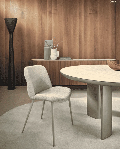 Stolica Onda je dobila ime po jedinstvenoj konturi sedišta, čije vijugave linije evociraju kretanje mora nalik talasima. Njene meke proporcije dopunjuju vitke, metalne noge.